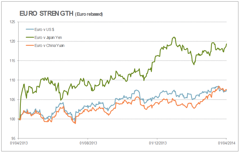 Japan and China have been the most aggressive in devaluing their currencies which has the consequence of making their exports more attractive and imports more expensive, in effect exporting deflation. With the US and UK aficionados of quantitative easing, which as a by-product is likely to reduce a currency’s relative strength, the EU appears oblivious to the consequences of allowing the Euro to rise against its competitors, or unable to react.