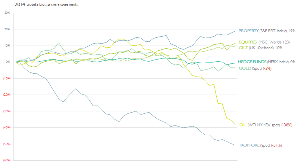 Governments bonds were the among least favoured of asset classes at the start of the year with most prognosticators forecasting poor results due to rising interest rates. In the event they produced strong returns, particularly long dated issues, as yields compressed even further. Sovereign debt has ended up in a strange place. Italian 10 year debt has a coupon of 1.9%, Spain’s is 1.6%, whereas the same duration US debt yields 2.2%. While the raw data would indicate that US debt is higher risk (which it clearly is not) this mispricing is a function of expected QE across the Eurozone in 2015 unnaturally driving down gilt yields.