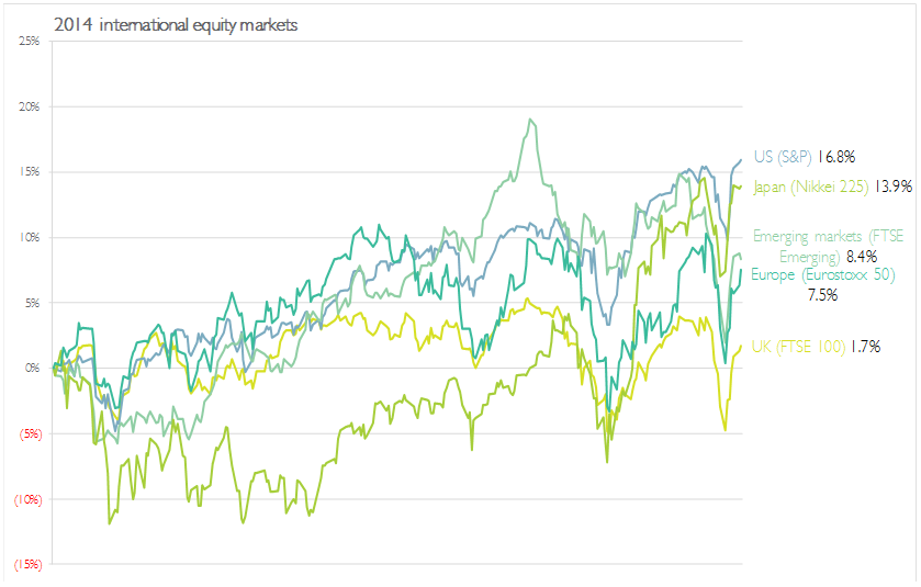 The Nikkei index fell during the early part of the year as progress on trying to reinflate their economy seemed to have stalled and the economy slipped back into recession. However it received a significant surprise boost at the end of October; Japan’s central bank announced it would pump trillions more into the economy by expanding its asset buying programme by a third and also buy property and stocks as well.
