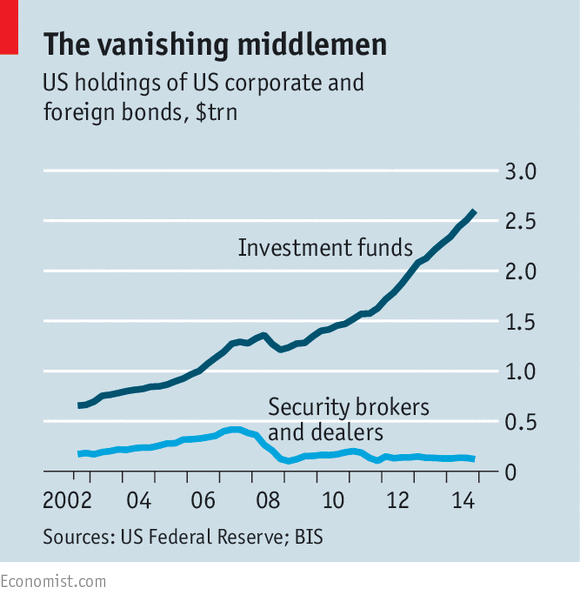 Additionally we remain occupied by some latent structural risks. Liquidity in corporate debt markets is a major concern. By liquidity we are here referring to the capacity of investors to sell their positions at a price close to the market price when there are many other sellers. If liquidity is adequate the seller gets the market rate. If liquidity is inadequate then the seller has to take whatever rate goes when there are no buyers. It was under these conditions that in the depths of the financial crisis forced sellers of a bond that would mature in three months at 100p would find the only buyers at 50p.