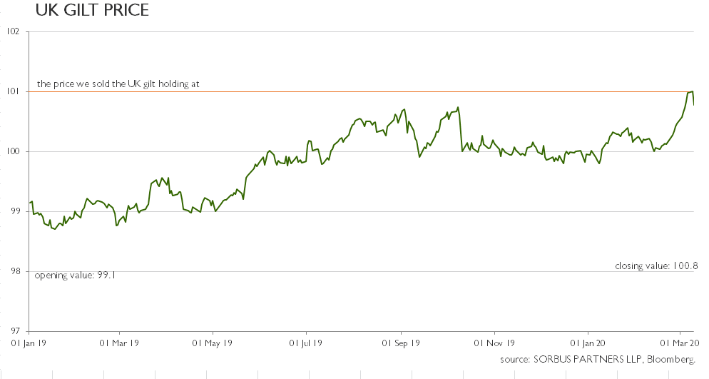 Cash yields virtually nothing and even if there is a nominal yield today we would not expect that to survive the government response to the coming recession – interest rates will be cut. Cash is liquid and neither increasing panic nor emerging calm will increase or decrease its value. It is now a better diversifier in a portfolio than debt investments. The proceeds of the sale of the sovereign debt will be held as cash for the time being, but these are fast markets and we will remain vigilant for protecting your wealth and growing it where we are able. We would be content to maintain these higher cash levels for the time being but when asset prices are so volatile there may be opportunities that emerge in the coming, hours, days or weeks where we can better use the cash in pursuit of your objectives. We will of course keep you informed should such a situation arise.