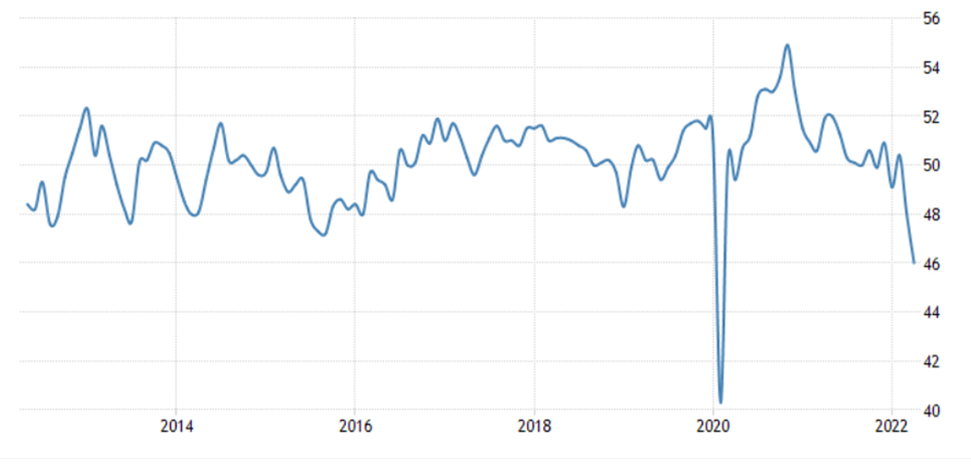 The Purchasing Manager Index (PMI) for the manufacturing sector is compiled by asking purchasing managers at firms about the outlook for their own business. A reading under 50 signals a contraction. The most recent data showed the headline reading dipping back into contraction territory.