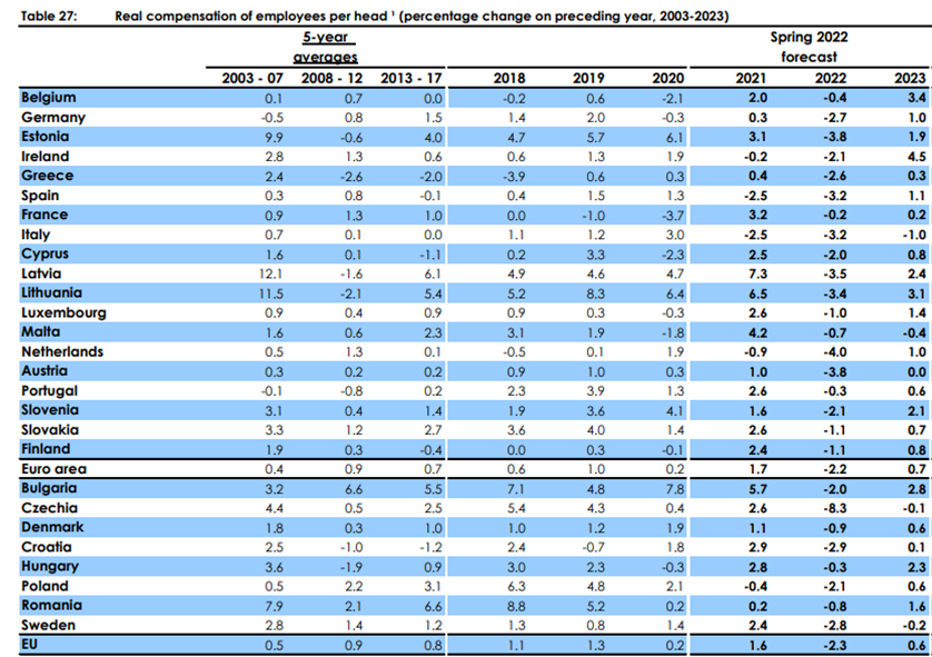 Across Europe the picture is similar. The new forecasts from the European Commission show real wages falling across the Continent this year.
