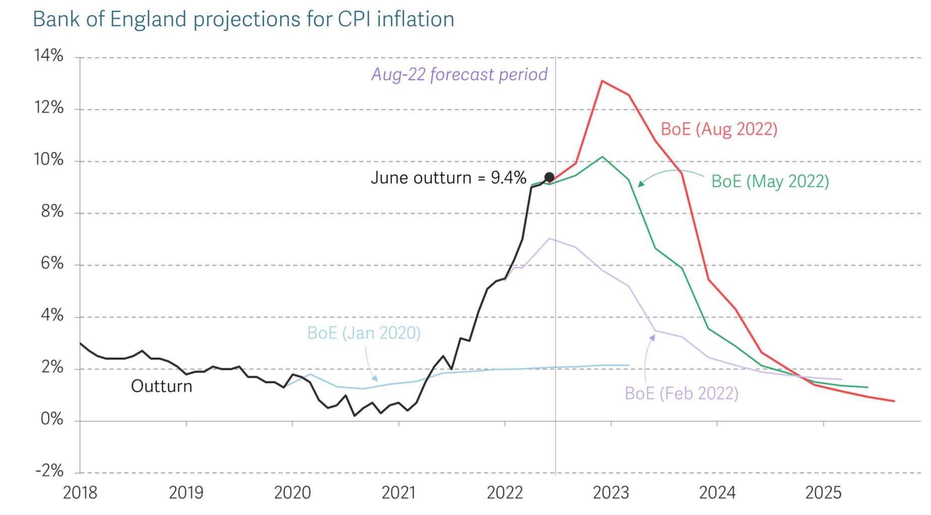 The US example is instructive here. The latest data shows the pace of CPI inflation accelerating slightly in the year to July, with prices rising at an annual pace of 8.5%, down from 9.1% the month before. That is still well above a comfortable level and one which will require more Fed hikes to bring down. But it is at least heading in the right direction. As evidence grows that wider US economic growth is slowing, then so is inflationary pressure. It is too early to conclusively say that US inflation has peaked – and there have been a couple of false dawns already this year – but the trend certainly looks more comforting than a few months ago. If the US peak has not been reached then market expectations are that it is almost certainly close. But the fall in inflation is not unmitigated good news; it mostly reflects the slowing of the US economy. As financial conditions tighten and consumer spending begins to weaken the jobs market will gradually loosen, vacancies begin to fall and eventually unemployment will rise. That is the cost of bringing inflation under control.