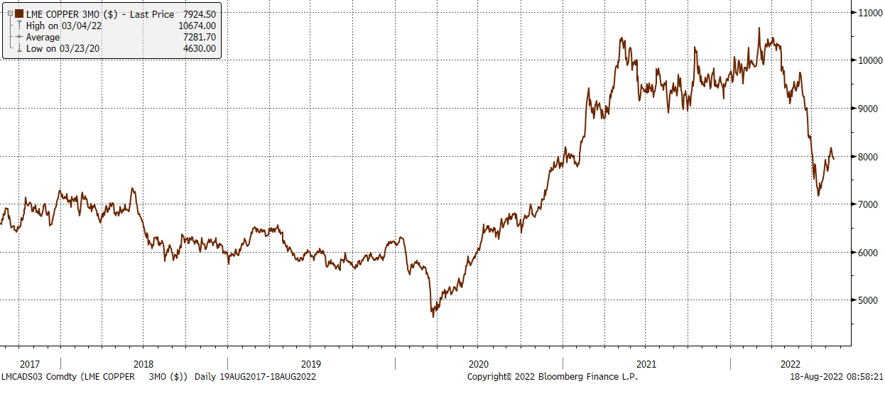 Mounting evidence of a serious economic slowdown in China is bad news for global growth but should, at least, help with inflation. Global commodity prices, outside of energy and food, are now well down from their highs. Copper, the bellweather for wider industrial metals, is down around 20% since early Spring.