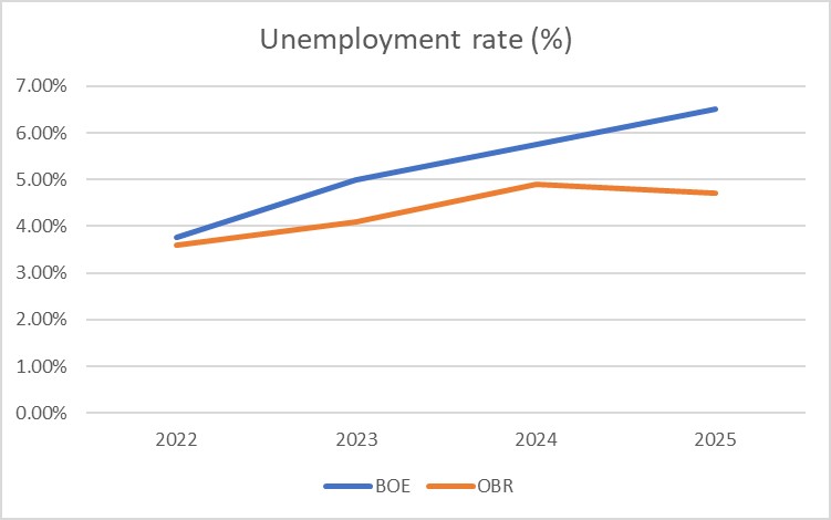 In the view of the BOE, unemployment will keep rising for the coming three years whilst the OBR sees not only a materially lower peak but a faster fall in the rate too.