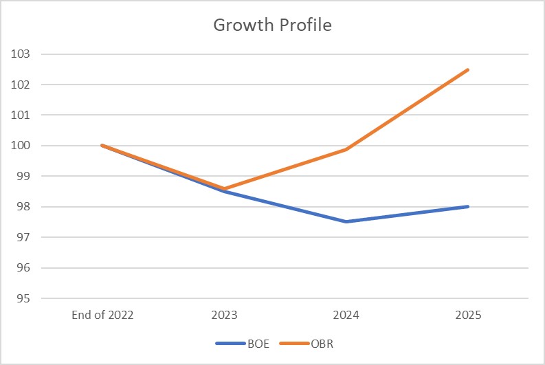 Over the last few weeks both the Bank of England (BOE) and the Office for Budget Responsibility (OBR), the government’s independent forecaster, have updated their own numbers. The BOE in its November 2022 monetary policy report and the OBR in its November 2022 economic & fiscal outlook. Whilst they both agree that household incomes are undergoing a historical squeeze and that growth is already moving in reverse, they agree on surprisingly little else.