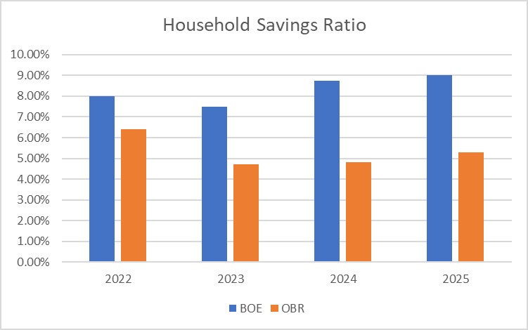 In the OBR’s scenario squeezed households will either run down previously accumulated savings or draw on borrowing to maintain spending whilst the Bank expects a greater consumer pullback.