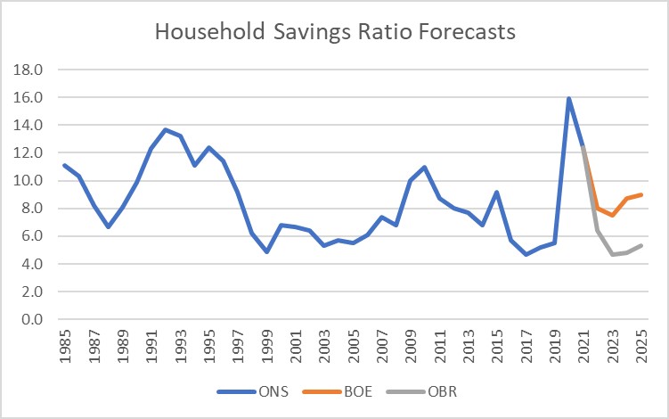 The key variable to watch is the household savings ratio, the percentage of post-tax real income that households – in aggregate – choose to save (or use to pay down debt) rather than to consume.