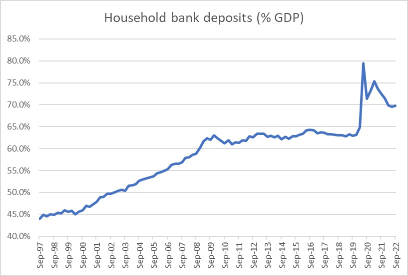 But perhaps it will be? The defining feature of the last few years of the business cycle has been the global pandemic. One consequence of the collapse in spending in 2020 and the enforced staying at home was the accumulation of a large stock of household savings.