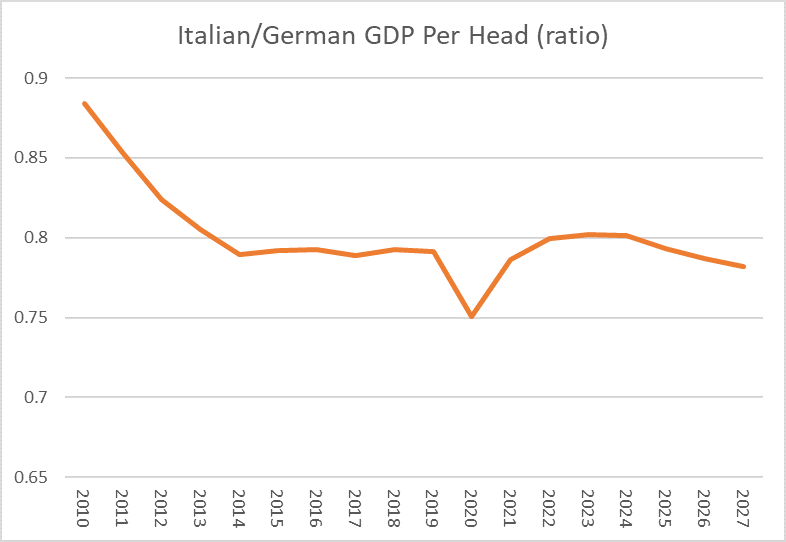 A look at the ratio of Italian to German GDP per head since 2010 (with IMF forecasts out to 2027) presents a worrying picture.