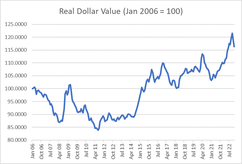 Measured against a broad basket of other currencies, it soared to a multi decade high in late 2022 – up almost 15% in just over a year.