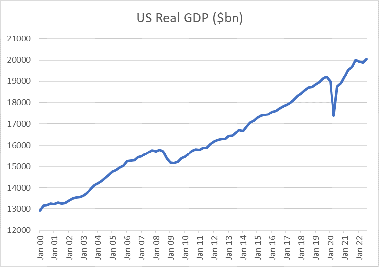 In many ways the US recovery from the pandemic-induced recession of 2020 has been extraordinary. After the 2008/09 downturn the level of output never returned to its previous trend. In sharp contrast, the high levels of monetary and fiscal stimulus applied in 2020 and 2021 saw the level of US output not only regain the pre-recession trend very quickly, but even surpass it.