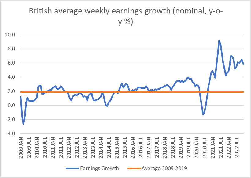 The British jobs market seems to have somehow contrived to give the economy the worst of all possible worlds. Wage growth is noticeably below the level of headline inflation and so households are experiencing a sharp fall in their real income and seeing their living standards decline with an unpleasant knock on impact on consumer spending and firms. And yet it remains high by recent experience, adding to the cost base of firms and pushing them towards larger price rises.