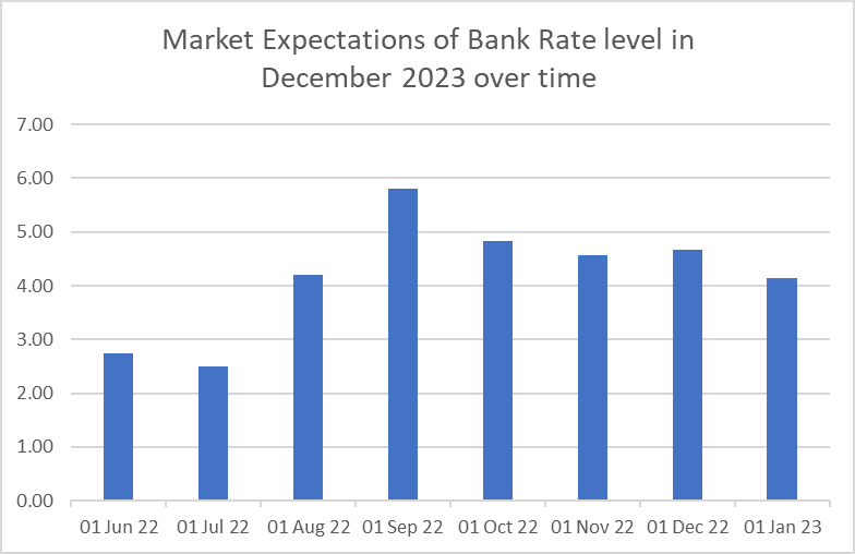 The best way to get a sense of the changing likely path of the Bank’s monetary policy is to look back at where financial markets expected Bank Rate to reach by December 2023 since last summer.