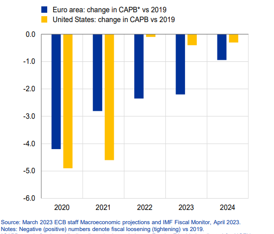 The US fiscal approach was to go for a large injection of extra demand into the economy in 2020 and 2021. The result was both a faster economic recovery and a more entrenched inflation problem in 2021 and 2022. But despite the continuing rhetoric of the Biden administration, US fiscal support became much more scarce in 2022 and is expected to remain so in 2023 and 2024.