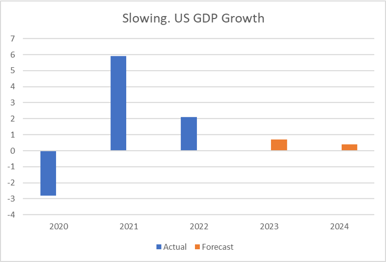 The US economy motored ahead with growth of almost 6% in 2021, easily making up the losses in the pandemic and still managed a robust 2.1% last year at a time when much of the global economy was stalling. This year however the Conference Board, the most respected US forecaster, has pencilled in an expansion of just 0.7%, followed by less than half a percentage point in 2024.