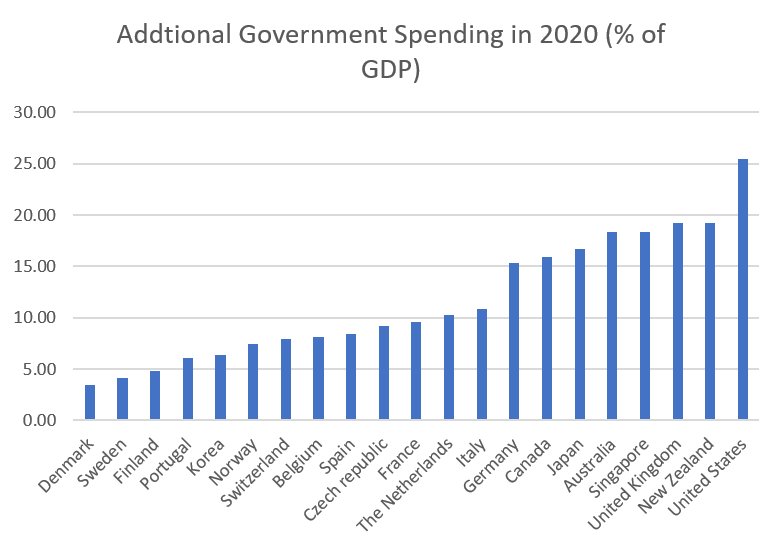 In magnitude, and expressed as a share of GDP, the extra US fiscal largesse in 2020 was higher than that of any other advanced economy. Indeed it was more than twice as large as the advanced economy average. Simply put, it was the largest peacetime fiscal expansion carried out by any advanced economy on record.