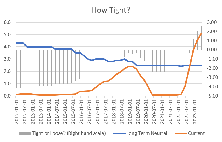 Overlaying the actual Fed Funds Rate onto the Fed’s own view of what is neutral gives a sense of just how tight US monetary policy is – or at least how tight the Fed believes it to be (which is a useful thing to know in and of itself).