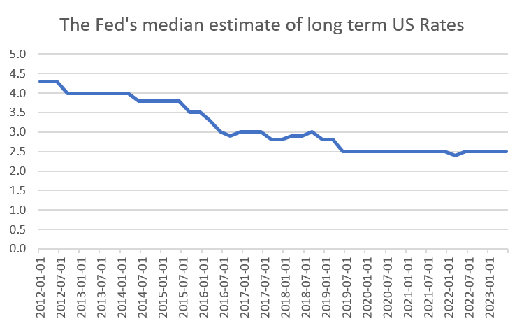 The big picture is that throughout the 2010s, the Fed revised down its view on neutral. Whilst it used to think 4.5% was about the normal level of rates it came to realise that demographic changes, rising debt levels and all sorts of other factors had reduced the level of rates in the longer term. In simple terms, if household debt levels double then one might expect the neutral interest rate (the one which is neither a stimulus or a sedative to consumer spending) to halve.