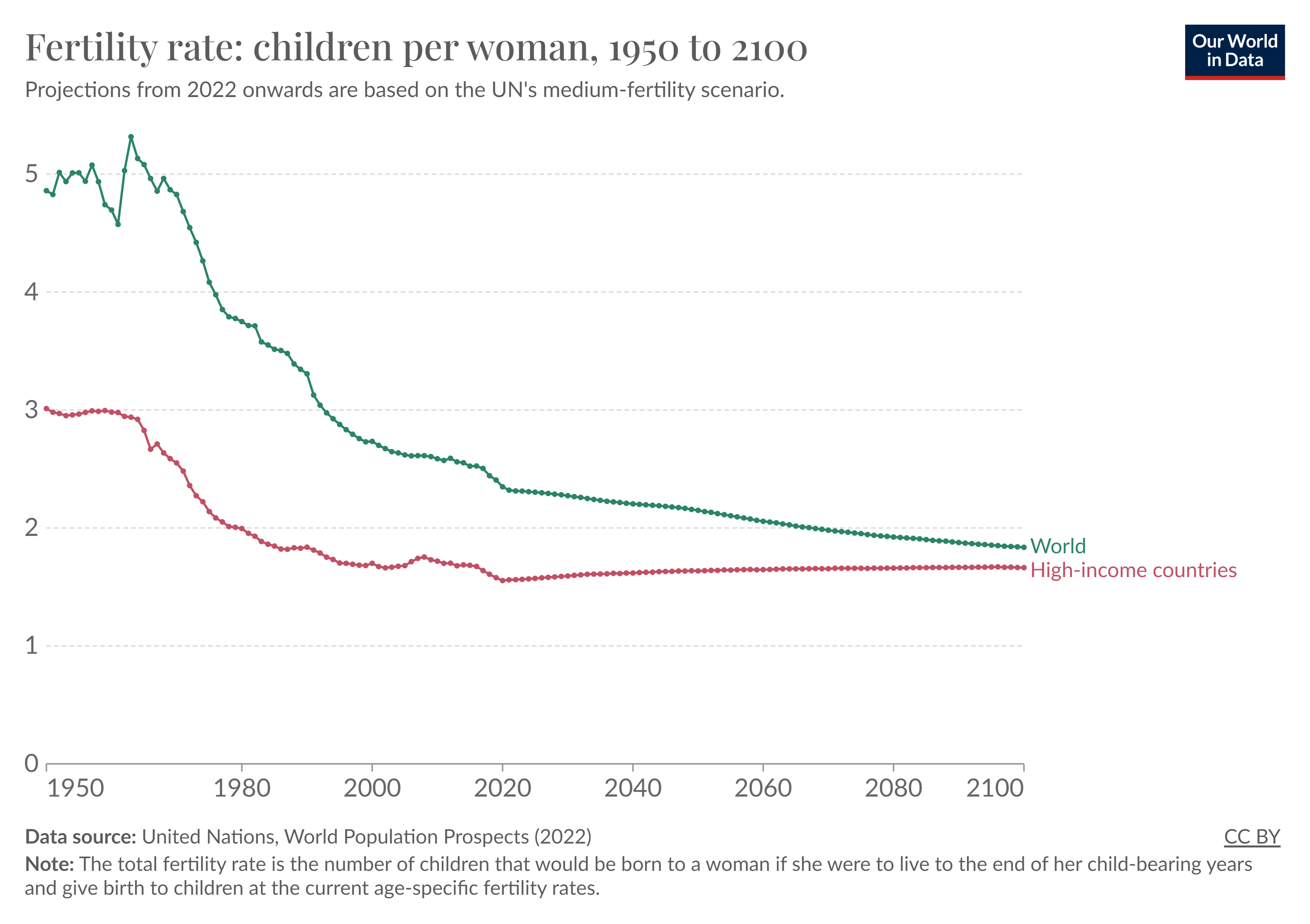 The global fertility rate – the amount of births the typical woman will have over her lifetime – has fallen from more than 5 in the 1950s to 2.3 today – and from more than 3 in rich countries to 1.6 today. The UN reckon that the global fertility rate will drop below 2 – or the replacement rate – in the late 2060s. If that was correct – the peak in global population would be hit at some point later this century.