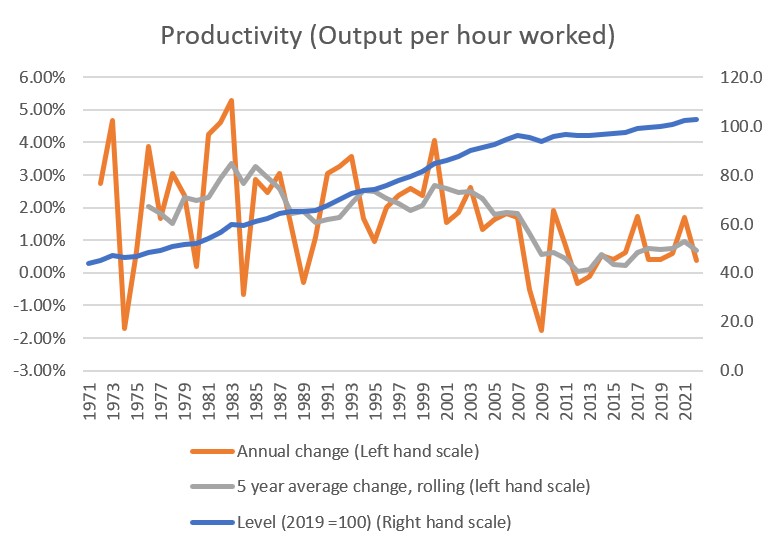 Paul Krugman, a Nobel prize winning economist, is fond of saying that ‘productivity is not everything, but in the long run it is almost everything’. Ultimately, he is correct. Whilst inflation and unemployment are the immediate economic issues that people feel day to day and tend to grab the media headlines and dominate political debate, productivity growth is the real driver of long-run economic performance. Effectively an economy can grow in one of two ways – it can add more workers to produce more output or it can find ways to make better use of existing workers and get more outputs from the same level of inputs. Only in the latter way can output per head, the crucial measure of incomes and spending power, grow in a sustainable way. It is rising productivity that underpins rising living standards and creates economic growth that actually feels like economic growth. It is also rising productivity that ultimately underpins corporate profit growth in the longer run.