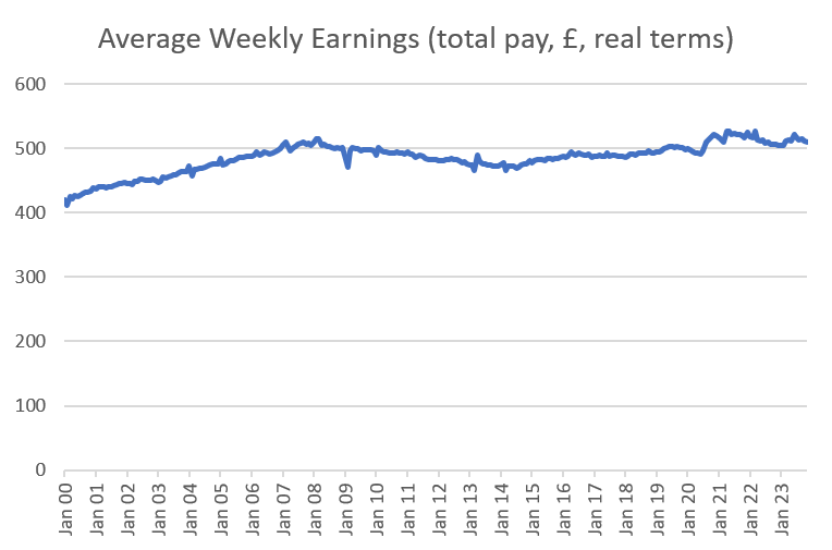 Real wages, adjusted for changes in the price level, have suffered over the last 15 years. The actual real level of weekly pay is currently lower than it was in 2007 and not expected to recoup those heights until around 2027. Not since the early 1800s has Britain experienced two decades of stagnating real pay.