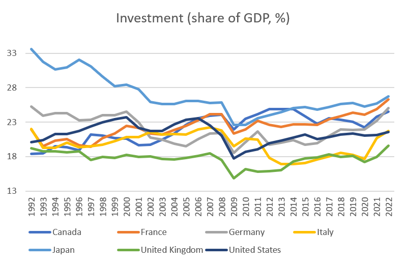 One factor sitting behind the poor performance of recent years is no doubt to be found in investment. Total investment levels – public and private – are unusually low in the UK, compared to its international peers.