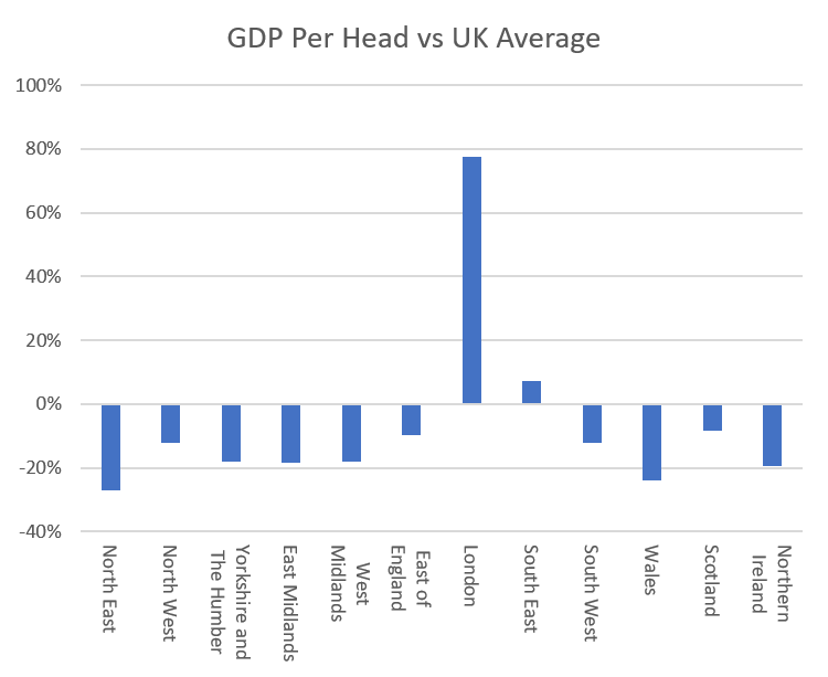 The level of GDP, income and productivity varies enormously across the United Kingdom. Indeed there is almost no such thing as an economically average place in Britain. GDP per head in the south east of England is roughly inline with the national average but that is about it. In London it is almost 80% higher and everywhere else, varying degrees of much lower.