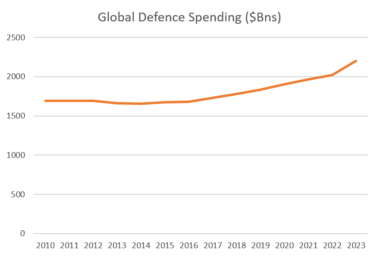 Global defence spending leapt by 9% in 2023 and is expected to grow at a similar rate in 2025.