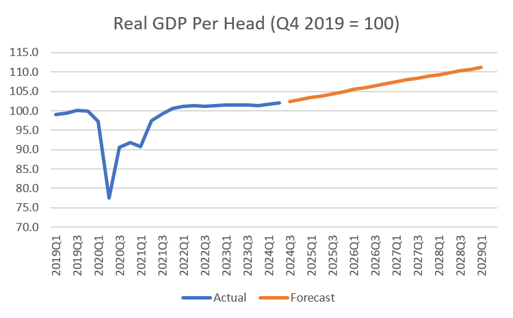 If one wanted to tell the story of the election in one chart, the above would not be a bad starting point. It shows national income per person since the last election and the Office for Budget Responsibility’s forecasts of its likely course over the next five years.