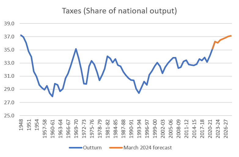 Taxes as a share of overall national income are now at their highest level since the 1940s and, on the assumption of no change in policy, are set to drift higher still in the years ahead.
