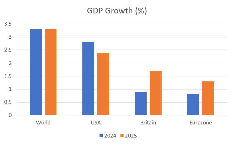 This then is the macro-backdrop to 2025. The world economy continues, as a whole, to expand at roughly the same rate as in 2024. But beneath the surface, there are tensions. The United States continues to grow above trend and may face stubbornly high inflation. Meanwhile both China and the Eurozone face weak growth and inflation which is too low rather than too high. Britain, unfortunately enough, looks set to have inflation which is a touch too high and weaker growth.