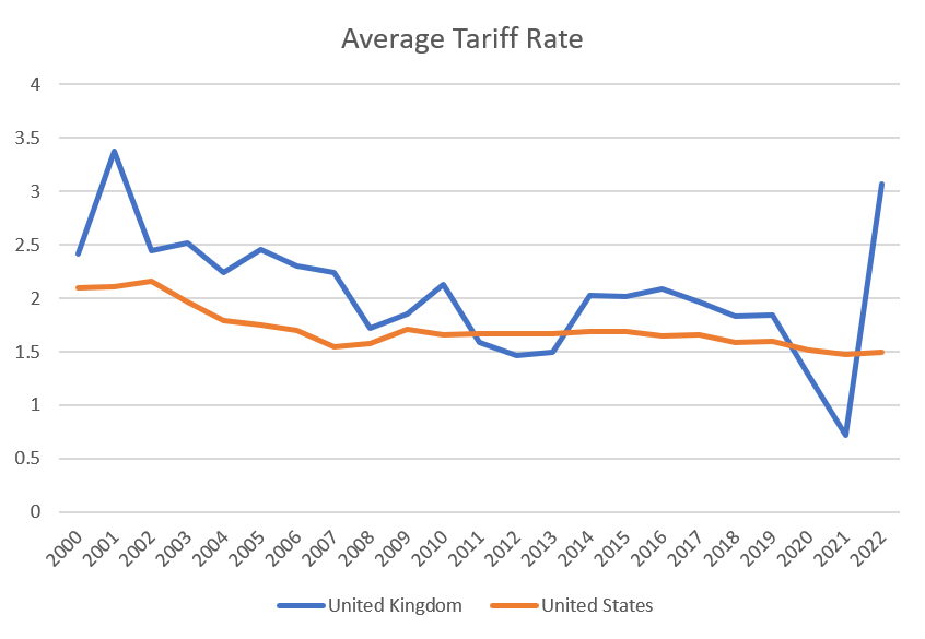 The chart above shows the average tariff rate charged on all imports over the last two decades. Even when they were raised it tended to be on specific goods (notably steel) and often came with exemptions.