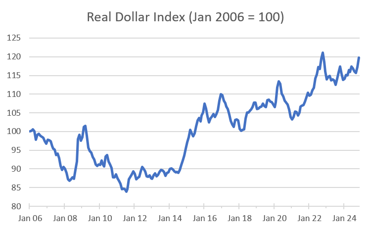 Against a broad basket of other currencies, the real value of the dollar (accounting for differing levels of inflation) is up 3.7% in the last 12 months and more than 11% since the beginning of the pandemic. As Spotlight has previously noted, a stronger dollar tends to both depress the level of global trade and tighten financial conditions outside of the United States.