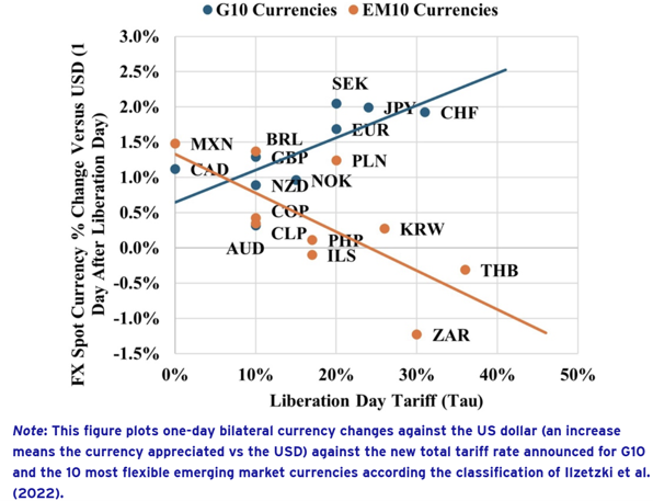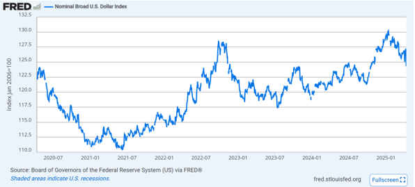 In the days following the major tariff announcement on April 2nd, stock markets were rough and US government bonds fell in value, as discussed in previous notes. But more interesting, from an economic point of view, was the behaviour of the dollar.