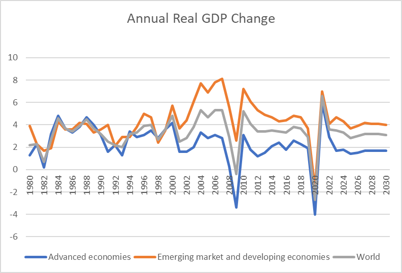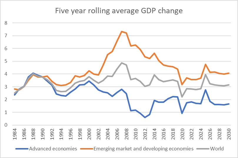Sometimes it is worth steeping back for a moment and looking at the bigger picture. The IMF’s data series begin in 1980, so by plugging in the historical outturns back to 1980 and the forecast numbers for 2025 to 2030 one can take a look at fifty years of economic history in one chart.