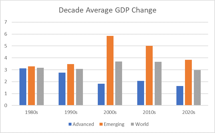 On the basis of the IMF’s five year forecasts the 2020s will see the weakest growth amongst the advanced economies as a whole in five decades. And whilst the emerging economy will also slow, relative to the 2010s, it will remain at a much brisker pace.