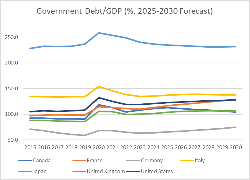 The above chart takes its numbers from the International Monetary Fund’s Fiscal Monitor, published this Spring. The ratios for 2025-2030 all represent forecasts.