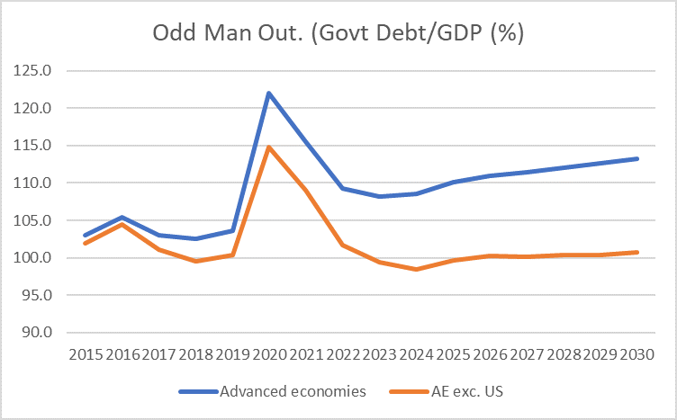This shows the debt ratio of all advanced economies in aggregate and the same category minus the United States.
