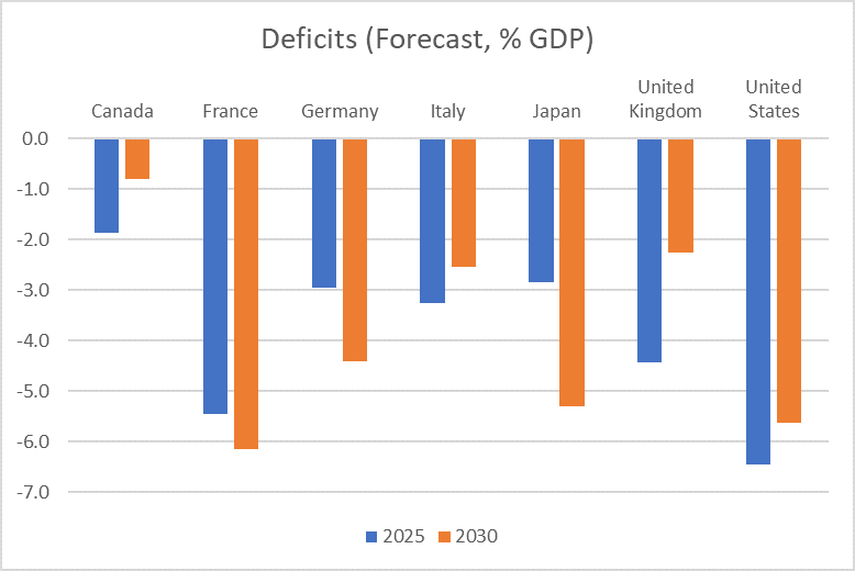 Sticking to the comparable IMF numbers, the chart above shows the projected annual deficits across the G7 this year and in 2030.
