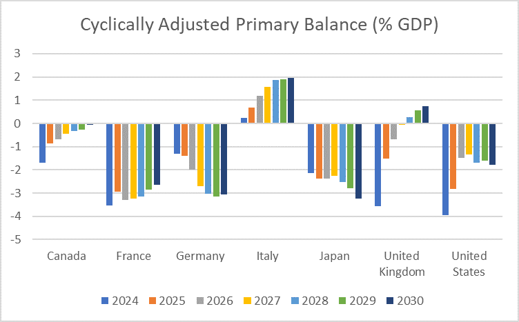 The above chart – again constructed using IMF data – takes more explaining. The measure shown is the cyclically adjusted primary deficit or surplus. Cyclically adjusted, in this case, refers to adjusting the raw numbers for where an economy is in the economic cycle.