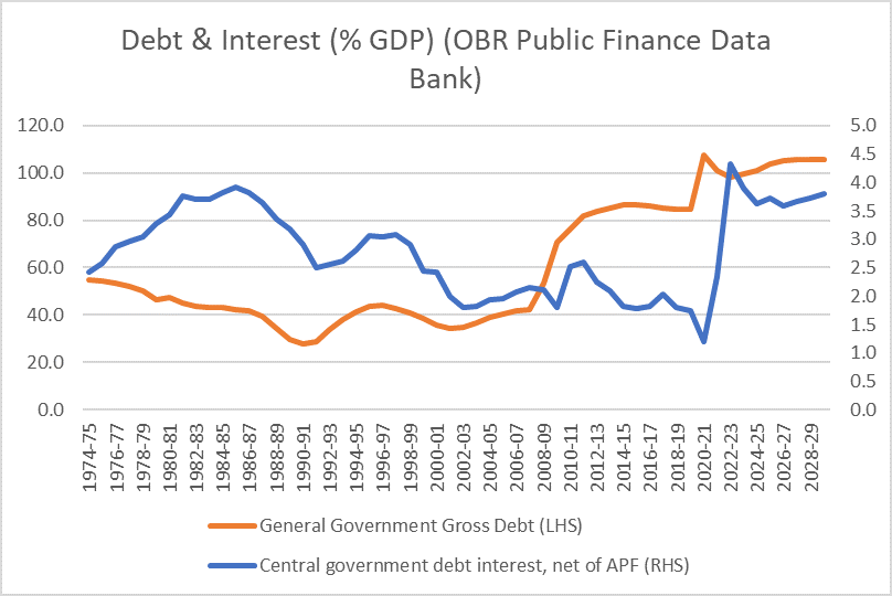 Of course whilst a measure excluding interest payments is a useful exercise, debt does have to be serviced. And the rise in service costs has been the major factor in changing the outlook for public finances since the pandemic.