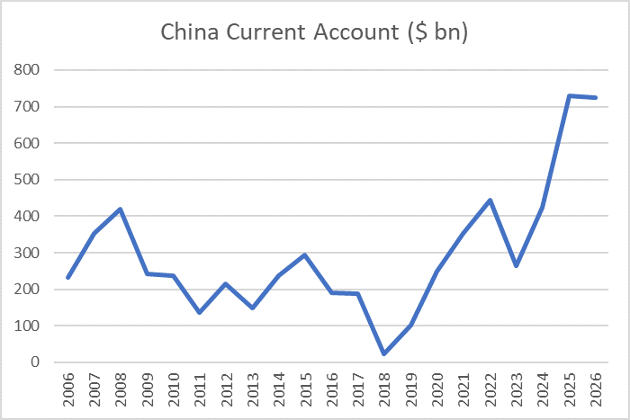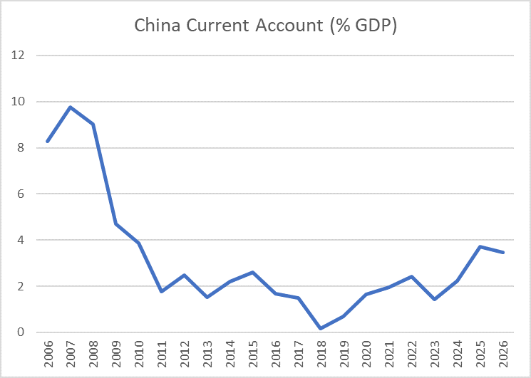More recently though, it has begun to rise again. By 2019, before the pandemic, China’s current account surplus had fallen to under 1% of GDP, but it is now comfortably back over 3%. Of course, that looks materially lower than in, say, 2006. But China’s economy is much larger than it was twenty years ago.