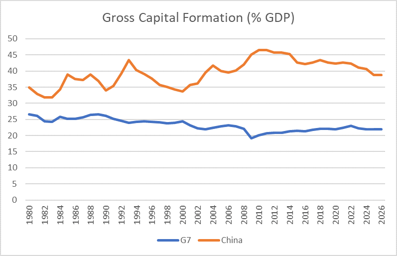 The G7 nations devote around 20% of their output to investment and consume the rest. China invests around twice as much.